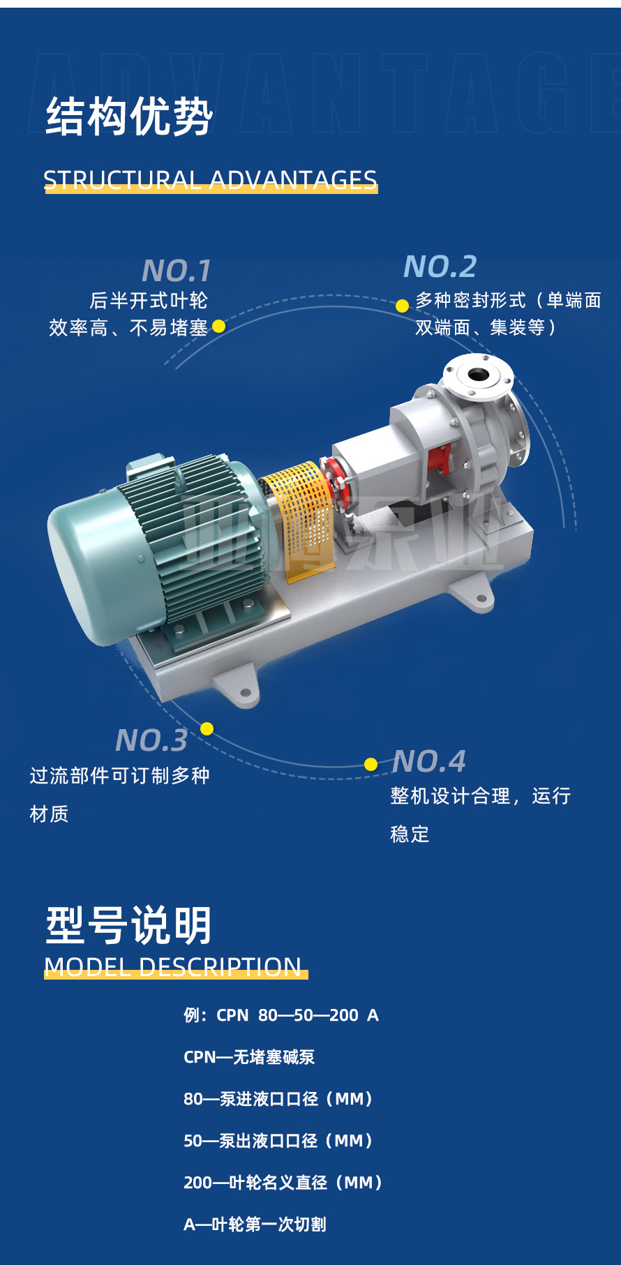 CPN型堿泵葉輪為后半開式結(jié)構(gòu),不易堵塞,效率高,運(yùn)轉(zhuǎn)時(shí)產(chǎn)生負(fù)壓。配備雙端面或單端面密封,可輸送含有固體顆粒,易結(jié)晶的介質(zhì)。該型泵可耐150℃高溫,使用時(shí)需加冷卻水。