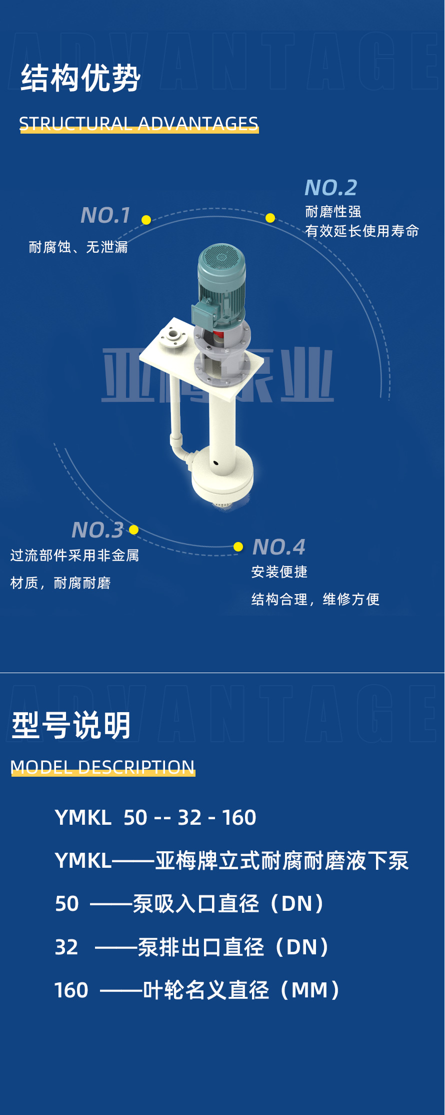 YMKL 系列立式耐腐耐磨液下泵是我公司結合國內外同類產品研制生存的一種非金屬材質單級單吸長軸液下泵,該泵適用于輸送溫度在0℃~+100℃,含固體顆粒、磨料的強腐蝕性的介質。